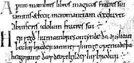 | Finally, just to show how a single scribe could thoroughly integrate and contextualise these scripts, a segment from Aelfric's Latin Grammar of the 11th century shows different letter forms for the Latin words embedded within the Old English text. | ||||