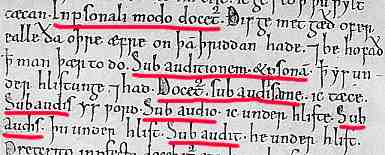A segment from Aelfric's Latin Grammar (Cambridge University Library, MS HH.1.10, f.49b). The lurid red underlining, only on the digital version you will be pleased to know, shows the Latin words in the text. (From New Palaeographical Society 1908) | |||