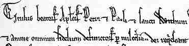 The scribe for Old Minster at Winchester has used a neat Gothic charter hand with calligraphic capitals, tall wiggly abbreviation marks as in the second word beatorum, wedged ascenders and an extravagant backsloping d. |