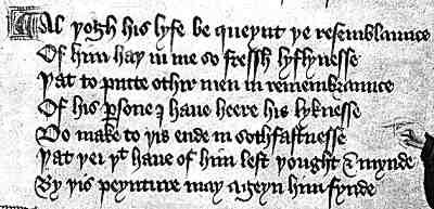 | This passage comes from a 15th century copy of Thomas Hoccleve's Regement of Princes, composed around 1412 (British Library, Harley 4866, f.88). The passage refers to Chaucer, whose portrait accompanies it. Note that his finger points more or less to the words his lyknesse in the passage where the image is discussed. By permission of the British Library. |