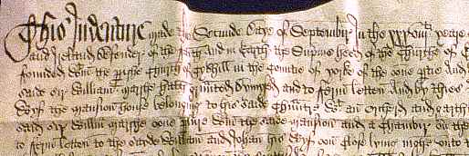 Distinctive letters : This 16th century hand is very upright, with extravagant angular loops. The letters g, h and x have closed loops below the line, while b and d have closed loopy ascenders. The letter e is very variable, sometimes looking as we know it, sometimes lke a figure of eight, and sometimes apparently back to front. The letter w is enlarged and curly. There are two forms of s, the long form and the short and curly, but r appears in a simplified form that drops below the line. The descender of q is open and bends to the left, like a modern g. The letters n, u and v are indistinguishable, which leads to endless debates about how certain words should be spelled, such as graunted or grannted. As the spelling is, to our eyes, eccentric and often inconsistent, this is probably a fruitless argument. There are no examples of j or z present. The sample shown is only from the top left corner of the indenture, so it is not continuous text. To pick out a few phrases, pass the cursor slowly over the lines of text. To examine the whole thing you need to proceed to the paleography exercises. There you will also find out the significance of this early modern document to medieval history and the story of medieval writing. |