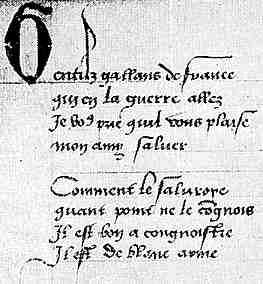 | This is a couple of verses from an anonymous French popular song of the 15th century (Bibliothèque National, ms. franç 12744). (From Bédier and Hazard 1923) | |
