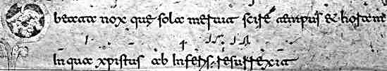| This segment comes from a late 11th century exultet roll from Italy, formerly in the abbey of Montecassino (British Library, add ms 30337), by permission of the British Library. |