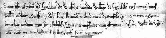 | In this document one Alan de Witcherche sells three serfs for a silver mark. The script is a neat calligraphic charter hand. The names of the witnesses are added at the bottom in a similar, but more untidy, hand. | |