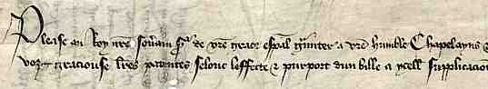 | This is the left hand end of a long narrow petition in French to Henry VI from the abbot and convent of Notre Dame de Combe in Warwickshire. It dates from 1441. The endorsement of the clerk of the council is on the verso of the document (London, National Archives E28/G8/18). By permission of the National Archives. | |