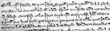 | This segment is from a 13th century charter (British Library, Harleian Charter 45 A36). The text shown here is not continuous as it is taken from the upper left quarter of the sheet. By permission of the British Library. | |