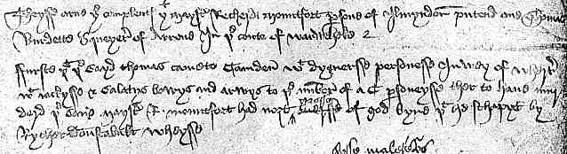 | This is a segment from a petition (National Archives, London E.28/76/31) of 1445-6, written in what can only be described as an ordinary cursive hand. The petition, from one Richard Mountfort, complains that one Thomas Burdette has made several attempts upon his life. By permission of the National Archives. | ||