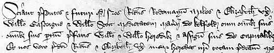 Distinctive letters : This particular cursive charter hand is relatively formal but rather spiky. While letters such as b, d and l have looped ascenders, they tend to be angular. The trickiest letter to identify is r, which is very simplified and extends below the baseline. The letter e is very loopy and appears to be back to front. Both the tall and the short and curly forms of s are present. It can be difficult to distinguish c from t, as the former tends to be angular and the latter is short. From the examples above it would appear that u and v are differentiated, but this is a bit of an illusion. They are identical when they appear in the body of a word, and are also identical, but with a different form, when they appear at the beginning. The form of v in the example set is identical to u in the word uxor at the end of the first line. There is a tendency for the letters i, m, n, u and v to disappear into rows of angled lines when they appear in any sort of sequence. The English letters k, w, y and z are represented in English place or personal names. While k and w only appear as first letters which one might expect to be capitalised, the form tends to be the same when they appear in the middle of a word in writing of this period. There are numerous abbreviations in the text. As the sample comes from one corner of the document, it is not continuous text. However, to extricate some words, pass the cursor slowly over the lines of text. To examine the document in more detail, proceed to the paleography exercises. |