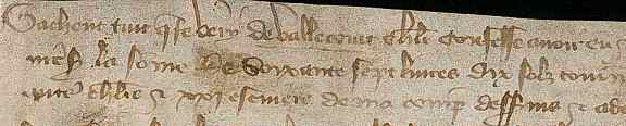 Distinctive letters : This is a somewhat rough and untidy Gothic cursive document hand. The letters selected for the alphabet are some of the more carefully formed examples from the document, but many others are more carelessly written. In general, the letters tend to an angular Gothic form rather than a rounded style. Distinctive characteristics include very thickened ascenders and descenders on letters like s, f and l, sometimes apparently having a second pen stroke down the letter. The letters g and y have curly descenders, and g is formed like a y with a horizontal stroke through the top. The letter j has an extravagant curl on top. The letters d and b have very curled ascenders. There are two forms of s, the tall and the short form, although the latter varies from a very curly type which looks a bit like an 8 to a fairly minimalist squiggle. As with many scripts of this type, the small letters can tend to form themselves into indistinguishable rows of minims, as i, n, m, u, v and even r become difficult to untangle. There are no examples of k or w, but z appears several times. The spelling is rather different from modern French, and there are no accents over the letters. There are numerous abbreviations. Pass the cursor slowly over the bit of the example given to pick out some words. This document has a rather interesting place in the history of the Hundred Years' War, but to find out more about that, you will have to go to the paleography exercises. |