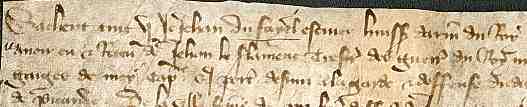 | This shows the upper left hand corner of a document of 1385 in the French language, in which a French esquire acknowledges payment from the paymaster of the king's wars for defence of a castle in Picardy, from the private collection of Rob Schäfer. (Photograph © Rob Schäfer.) | |