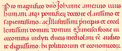 Distinctive letters : This can be described as a humanistic display script which still has much in common with formal Gothic book hands of the rotunda variety. Italian scribes never really adopted the highly compressed Gothic forms. This rounded hand mostly uses formal versions of the letters from Caroline minuscule, the script which was deliberately revived in the Italian Renaissance. Although not highly compressed, it retains some conjoined letter combinations such as do and be. Letters such as i, u, m and n are well separated however. There are two forms of d, the backsloping Gothic form and the upright Caroline minuscule form. Both the upright r and the minimalistic r found after vowels appear, as do both the short and tall forms of s. The letter i is delicately dotted. The letters i and j, as well as u and v are identical, as usual. There are no examples of w or z. There are a few abbreviations in the text. Pass the cursor over the first few lines for a taste, and continue to the paleography exercises to examine it in more detail. |