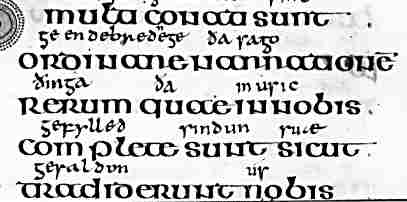 | The Latin text is an insular half uncial, very formal and rounded. The 10th century Old English gloss between the lines is a pointed insular minuscule. |