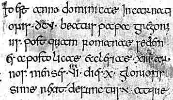 The script may appear difficult because of the unfamiliar letter forms, but it is open and clear and the words are usually well spaced. It's really a case of getting the eye in, and it is very elegant. The passage illustrated includes Roman numerals and an abbreviation for est which is particular to Anglo-Saxon and Irish writing. Pass the cursor slowly over the lines of text for decoding clues. And the quick quiz question is, exactly how long did Pope Gregory reign before he died? |