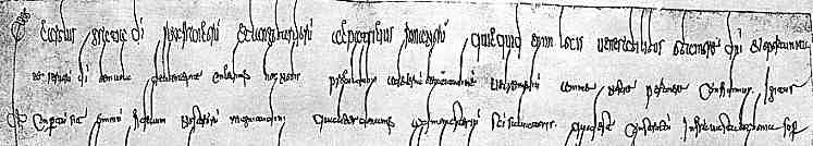 Distinctive letters : While there are some strange letter forms here, the thing that makes this script very difficult to read is the way in which the letters are elongated and compressed. The examples in the alphabet above have been mainly taken from the enlarged top line, where the letter forms are essentially similar to the rest, but not quite so exaggerated and a little easier to make out. Add to this the fact that the script is cursive as well as squashed, the letter forms are a bit variable and there are ligatures, and you have something which is truly horrendous to read. I must confess I really cannot read a lot of it and am relying on the transcript provided by Dr Steffens. Getting down to details, a is open at the top; b has a funny little horizontal extension; c has an extraneous squiggle on the top in the heading, but this disappears sometimes in the smaller text below; d is extended below the line as well as above. Well, there is something a little peculiar about all of them. The ascenders of letters like b, d, h and l are very tall and curved, although the descenders of p and q are short and g is short and curly. The majuscule form of n appears occasionally, usually but not always at the beginning of words. The letters i and j are not differentiated, and neither are u and v. There are no examples of k, w, y or z in the example. There are a few abbreviations in the text, but they are not numerous. The one consoling thought is that surely all known Carolingian diplomas have been transcribed and published already somewhere, by somebody (I think). If you feel like a bit of a challenge, try the paleography exercises for this script. Otherwise, just run the cursor slowly over the first couple of lines and be amazed. |
