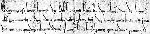 | This segment shows the first few lines of a papal bull of Pope Eugenius III of 1145 (Trier, Stadtbibliothek, Archiv Q 23).(From Steffens 1929) |