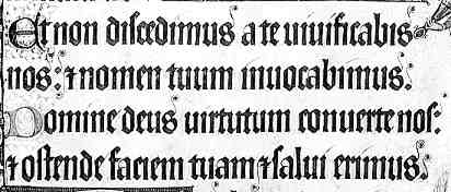 | This segment is from a very famous manuscript, the Luttrell Psalter of around 1340, now in the British Library. The page shown is f.149, the end of Psalm 79 and beginning of Psalm 80 in the Vulgate, or Psalms 80 to 81 in a modern Bible. (From New Palaeographical Society 1904) |