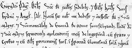 As usual, there is no k, y, z or j, but the letter w appears. It is not found in Latin, but it occurs here in English names in the list of witnesses to the document. The text is heavily abbreviated, and part of the trick of reading it is that it follows a fairly standard charter formula, or diplomatic. That is to say, you have a pretty fair idea of what most of it is about before you get into the niceties of reading every letter. Run the cursor slowly over the first few lines of text to get the general idea. For a more detailed examination of the document, proceed to the paleography exercises. |