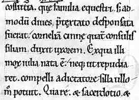 This example is from a 12th century French copy of De Vita Caesarum by Gaius Suetonius Tranquillus (British Library, Egerton 3055, f.2), by permission of the British Library. The script is a continental form of protogothic book hand. (This example is featured in Brown 1990). |