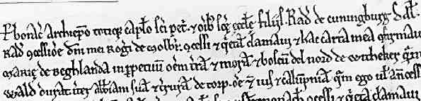 Distinctive letters : Compared to the other protogothic English document hand given in these examples, this sample is less elongated and spiky, with squarish angular letters. The individual letter forms are essentially similar. The letter a has an extravagant loop above it, making it look a bit like a d. The ascender of d, however, curls the other way. Ascenders of letters such as b, l or h tend to be notably wedged and even split at the top. The descender of q appears, to our eyes, to curl the wrong way, but is distinguishable from g which has a looped descender. The letter r is quite variable and three forms have been distinguished here, one with a curly descender. Only the tall form of s is used. The letters i and j are identical, as are u and v. The letters k, w and z appear in English place or personal names, but there are no examples of y. The letter i is not normally dotted, except where it is doubled, in which case the second i is extended down to resemble a j, as in the word