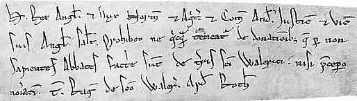 Distinctive letters : This spiky and angular chancery hand is essentially similar to those used for charters in the mid 12th century, when written out by the chancery rather than by the recipient institution itself, but is more informal and abbreviated when used for the less ceremonious document of a writ. (Check out the section on The Written Word for the significance of the terms charter and writ.) The notable features are tall, angular ascenders on tall letters, and slashing diagonal strokes on letters such as e and n. The Gothic backsloping d is used. Only one form of s is employed, that is the tall form, and only one form of r. Descenders tend to curl to the left, even with q, so that it looks very like g. The letter t is short. While j appears in a different form to i, it is at the beginning of a word and represents a capital form common to both. The same applies to an apparent differentiation between u and v, as u often assumes the angular form at the beginning of a word. The only example of w is as a capital, but minuscule and majuscule versions of this letter tend to be the same. There are no examples of k, y or z. The above illustration represents the complete document. Run the cursor slowly over it for an instant transcript. For more information of what it's all about, go on to the paleography exercises. |