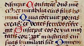 Distinctive letters : This example is taken from a psalter; not an elaborate showpiece, but what is clearly a simple working text. The letter forms are those of a Gothic textura script of relatively informal type. The letters are somewhat uneven, but it has no cursive qualities, and letters are quite clearly formed and well separated. It is quite easy to read, and there are few confusions among rows of minims as letters like u and n are readily differentiated. The letters, while not compressed, are very angular. Ascenders and descenders tend to be straight and relatively unadorned. The trickiest letter is probably c, which is flat topped and easily mistaken for a t, as in many later Gothic scripts. Intriguingly, they can sometimes be substituted for each other, as in the word iusticiam shown here. The letter a has the simple single chambered form, while g looks like a y closed with a horizontal line at the top, as is found in German and some French cursive scripts. The letters u and v are identical when they occur within a word, but both have a more angular form when they appear as the first letter. Two forms of r appear, including the simplified form which appears mainly after o, and both the tall and short and curly s are present. The letters i and j are identical, although when i is doubled the second i is elongated. The letters are dotted to allay confusion where they appear among other letters constructed of minims. There are no examples of k, w or z. Pass the cursor slowly over the segment illustrated to pick out some words. To have a more enthusiastic go at decoding this script, continue to the paleography exercises. |