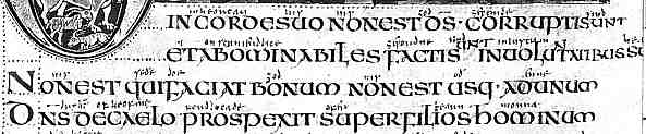 | This sample comes a famous 8th century English psalter, the Vespasian Psalter (British Library, Cotton Vespasian A 1, f.53r), by permission of the British Library. |