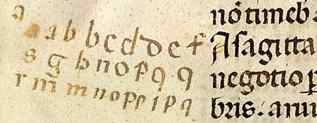 | When a scribe had recut or replaced a nib, it had to be tested and written in. They might use scraps of parchment for this, but sometimes the process is found in curiously inappropriate places. Writing out the letters of the alphabet ensured that the pen was working for all the different strokes. The example above is doodled into the blank margin of an otherwise elegantly written missal. | |||