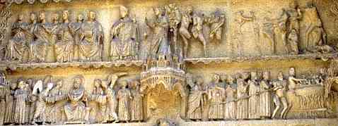 | The Last Judgment on a tympanum at Rheims Cathedral, showing the fates of souls. | ||||