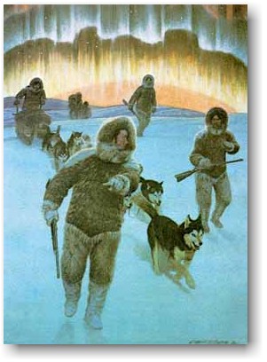 As the Aurora Borealis lights the sky, Lieutenant Ray and several Eskimos and their families travel inland. Their cold weather gear is fashioned from animal skins and is typical of the native clothing of the period. The dog sled is two meters long and one meter wide at the rear, tapering to about seventy centimeters at the nose. Over the wooden frame, deerskin is laced with leather thongs. Covering the equipment is a dog-skin rug. The men carry 1873 rifles, .45 caliber.