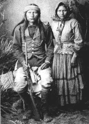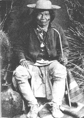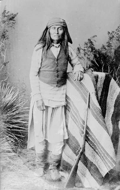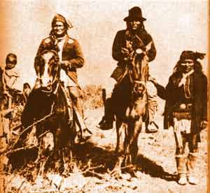 This photo is of Mangas, son of Mangus Colorado who was the leader of the Bendonkohe tribe of Apaches to which Geronimo belonged. All the Apache people admired him. Geronimo as would characterize the murder by the whites of Mangus Colorado, "perhaps the greatest wrong ever done to the Indians." He was lured to a peace conference by white gold miners in January of 1863. They thought if they held him hostage that they would be assured safe passage through the area. During the night he reportedly tried to escape and was shot. When discovered by the Apaches, who followed Mangus, it was probably the last straw that set off the hatred between the Apaches led by Geronimo and the whites. Following the death of Mangus Colorado, according to Geronimo, he became Chief of the Bendonkohe Tribe. However, he was not born into royalty so the true leader of the runaway band of Apaches that caused so much trouble for the American Troops was probably Naiche.