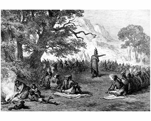 One morning they lay in ambush near a road cut for passage of American Army and supply wagons. A group of American troops approached and the Indians immediately attacked. Many other American troops joined the battle and the Indians were defeated. They suffered many sword cuts and gashes.