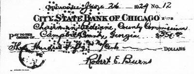 This is a copy of the check that Burns wrote to Campbell County to reimburse them for his capture and extradition in Chicago.