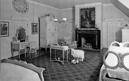 Mrs. Hewitt's bedroom adjoining the sewing room. The sewing room is located to the right.