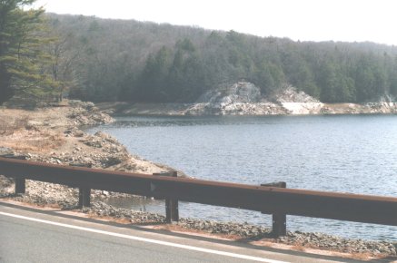 From the Great Valley the Housatonic River suddenly abandons the valley area to cut through the Housatonic Highlands. Then the river reaches a limestone area. It follows the Housatonic River Valley limestone area that is caught between the Housatonic Highlands (bordered with Taconic Mountain material on the south) on the northwest and the New England Upland on the southeast.