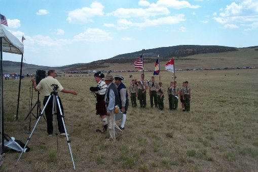 The Bagpiper, Drummer and Boy Scout Troup 188 Color Guard. Phil Walker, historian, author and talk show host is indicating where they are be positioned. In the background people are walking the ruts of the Overland Trail to the Dedication Site, very near the teepee rings. The Sheriff's Posse is also traveling along the ruts of the Overland Trail to the ceremony site, off to the left. This photo is looking south toward the "Horseshoe," a camping area used by many emigrants.