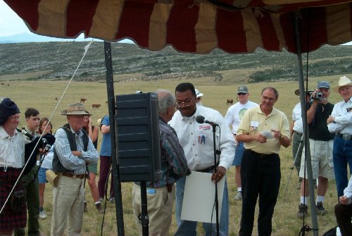Joe Rogers, the Lt. Governor of Colorado hurried back from the Republican National Convention in order to participate in this dedication event. Joe had just finished reading the Millennium Trail Resolution prepared by the White House Council on the Millennium, and is shown shaking hands with Frank Bales, noted historian from Denver and fomer member of the Eisenhower administration. Phil Walker, historian and author, is in yellow shirt.