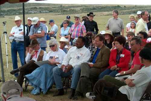 Attending the celebration of the Overland Trail were many honored guests, including legislators, historians, and authors. This photo shows seated from left to right: Derek Roberts of the Roberts Ranch, Elizabeth Lawrence, Overland Trail, Lt. Governor Joe Rogers of Colorado, Congressman Bob Schaffer, Larimer County Commissioner Kathay Rennels. State Senator Stan Matsunaka, and State Representative Bob Bacon are out of photo to the right.