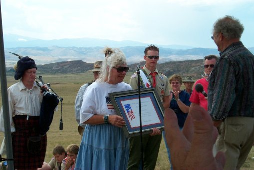 Frank Bales, Denver historian, reading the certificate from the White House Council on the Millennium designating the Overland Trail as an official Millennium Trail. This certificate was accepted by Elizabeth Lawrence, who has done extensive research on the Overland Trail, in behalf of the Larimer County Historic Alliance.