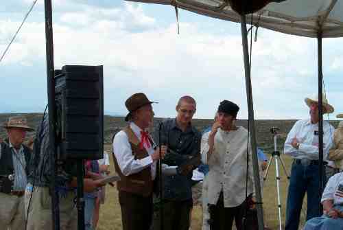 Derek Roberts reading a certificate of appreciation for J. Evan Roberts, his father, who was unable to be in attendance. This certificate recognizes the efforts of J. Evan Roberts as a "Steward of the Land" for preserving the cultural and historic sites on the ranch. The Roberts Ranch was homesteaded in 1873 by J. Evan's grandfather, Robert O. Roberts. Accepting the certificate in J. Evan's behalf is Ben Roberts (in the middle), the younger son of Derek. Burke Roberts, upon whose land the celebration took place, watches on.