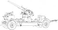 | QF 3-in 20-cwt AA gun and mounting on towed platform in action. | Similar gun shown in travelling position but with gun unclamped. |