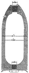 To cut down wear at first a papier maché (moulded paper pulp) gas check was inserted between the cartridge and the base of the shot or shell in the chamber, but in 1878 was replaced by a corrugated copper disc bolted to the base of the projectile as shown in the figure opposite. When the gun fired propellant gas pressure tended to flatten the corrugation in the copper disc, thus expanding the rim against the lands and into the grooves of the rifling. On some of the heavier projectiles, including the one in the figure, the rim of the disc was formed with studs in line with the projectile studs. On projectiles for guns with an increasing twist in the rifling the gas check was permitted to rotate. The shell illustrated is of Palliser form, of cast iron with hardened head, a 64-pr intended for use against masonry. |