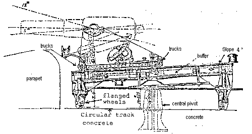 The gun and carriage were said to be mounted en barbette, that is to say on a sloping iron platform behind a parapet over which the muzzle protruded in the firing position. While the centre of the platform was secured to a pivot set in the concrete gun floor, each end of it stood on a pair of 'trucks', or small flanged wheels, which ran on a circular rail set in the floor. Thus the complete equipment could be traversed through any angle up to 360° according to the sector the gun was expected to cover.