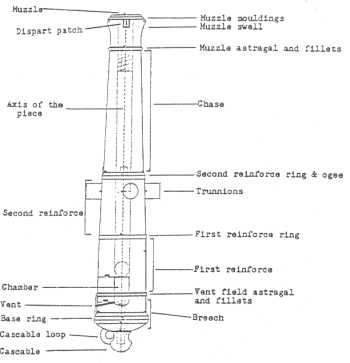 Parts of a SBML gun c. 1800. Prior to this date guns had an additional astragal and fillets just forward of the second reinforce ring, and no cascable loop. |