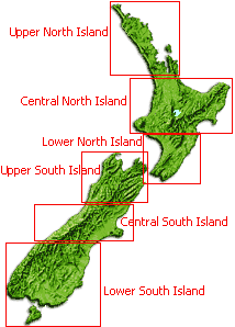 Upper North Island Central North Island Lower North Island Upper South Island Central South Island Lower South Island