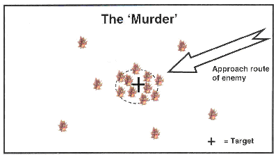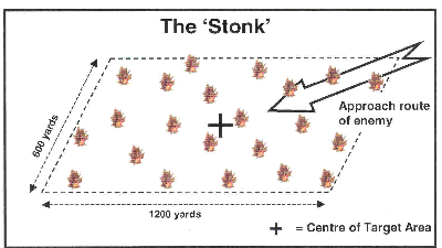 The Stonk differed from the murder by spreading the fire of 72 guns roughly evenly throughout a rectangular target area 1200 x 600 yards (later changed to 600 x 600 yards). It was particularly effective against area targets such as concentrations of infantry or soft skinned transport. |