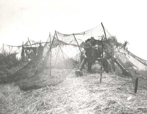 Although obscured, the closest gun was Sergeant Noel Evans's gun. Under the antique cam net is Bombardier Mike Subritzky (J hat) and