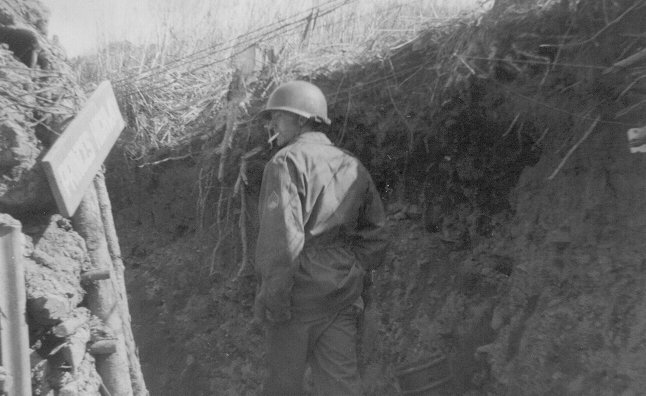 Sgt Slovack of the 936 FA Bn - wire crew - checking telephone wire from 936 to forward observer on hill.