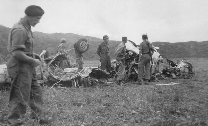 Wreckage of an F86 that had been hit over the line. Came into the small British air strip on an emergency landing with no power. The plane hit the jeep in next figure.