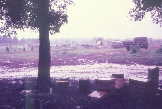 161 Battery deployed in the only open clearing for klicks around - a burial ground. The three guys at left are busy at volleyball. (Feb 1966)
