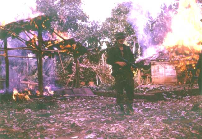 The village of Long Phuoc had been depopulated by US forces before the ANZAC Bde took over at Nui Dat. 6 RAR was tasked with denying the buildings to any enemy in the area. Most of the dwellings were timber and thatch, so gave in easily to the torch. Photo courtesy Captain Mike Dakin | |||